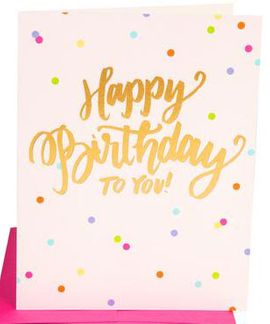 birthday confetti! hand-lettered and artisan foil-pressed in shiny gold foil on a 4.25" x 5.5" folded pink card. blank inside for your personal greeting.