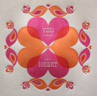 you have my heart! express your love anytime of the year with this sweet greeting card. artisan letterpress printed using soy-based ink on 4.75" x 4.75" 100% pure cotton rag paper. blank inside for your personal message.