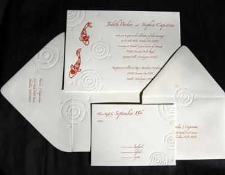 elegant koi! artisan letterpress printed on 100% cotton luxuriously thick 300 gsm paper in 1 ink colour of choice. shown in 2 colours: persimmon orange and blind letterpress. 2 colour pricing available upon request.