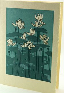 elegant water lilies! this beautiful all occasion card is artisan letterpress printed on an antique letterpress in 3 colours by hand, one colour at a time, on generously sized 5" x 7" folded creme textured cards with a fine 1-side deckle edge. notable for the 3-colour letterpress printing and the coordinating deckle-edged envelope flaps. blank inside for your personal message. art by decorative designers studio 1900 usa.