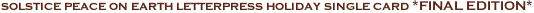 solstice sunrise! this beautiful winter holiday card is artisan letterpress printed in 5 inks on an antique letterpress, one colour at a time, and one card at a time, on a generously sized 5" x 7" folded creme textured card with a deckle edge on the cover. notable for the number of inks and gradient colour shading. inside greeting: "Peace on earth"