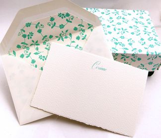 8 luxuriously thick flat notecards paired with creme hand-lined envelopes.