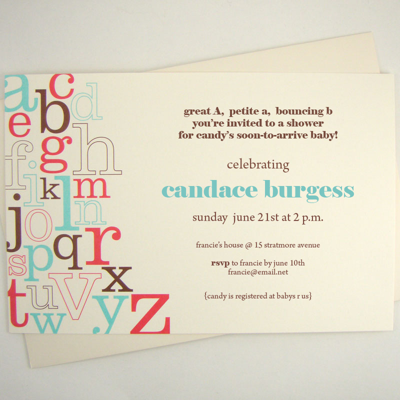 moderne alphabet invitation or announcement! personalize this invitation for showers, birthdays, book club events or an adorable baby announcement! flat-printed in a rainbow of colors on a 5.25" x 8" flat creme card. 30% post consumer recycled 80 lb. cover stock. twelve laser and inkjet compatible cards with creme envelopes.