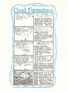 forecast cloudy! this informative card has the names of 10 different cloud formations (5 on the front cover and 5 on the back cover), with hand-illustrations and a hand-lettered description. artisan letterpress printed by hand, one colour at a time, on a generously sized 5" x 7" folded creme textured card. inside is blank for your personal greeting.