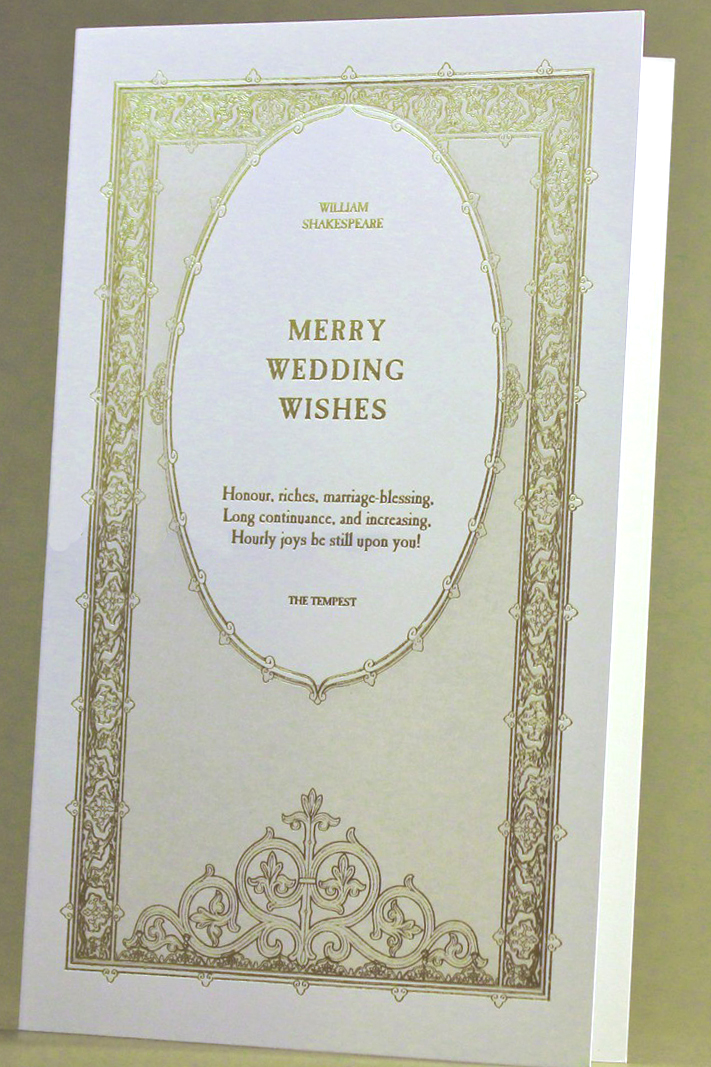english literature inspired birthday wishes! this finest quality luxury birthday greeting card is artisan letterpress printed in soy-based ink + gold foil on a 3.5" x 6" luxuriously thick folded creme card. shakespeare quote on cover reads "Honour, riches, marriage-blessing, Long continuance, and increasing, Hourly joys be still upon you!” blank inside for your personal note.